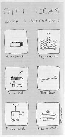 This month in Spy, a cartoon by “DDiefendorf” entitled “Gift Ideas with a Difference” includes bundled oblong items labeled Pile-o-Stuff.