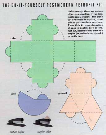 Unfortunately, there are certain objects – umbrellas, Hyundais, tackle boxes, staplers – that aren’t yet available in stylish, overpriced postmodern versions. Thus this kit – postmodern shapes in postmodern colours. Just cut, assemble, and affix to a stapler (or umbrella or Hyundai or tackle box).