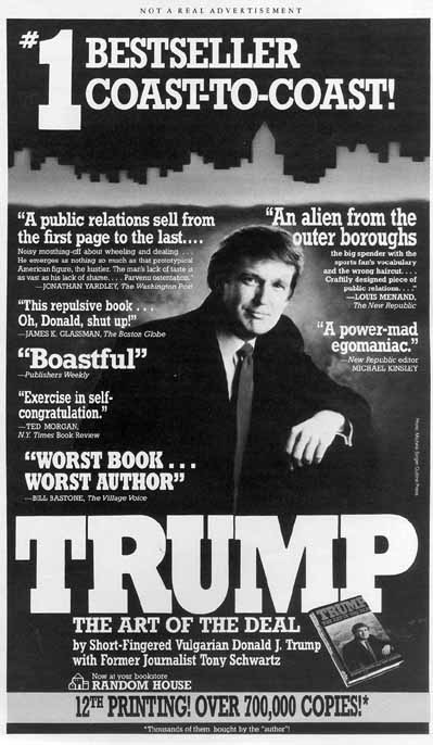 Page 44 shows us a twee and abjectly failed effort at parodying an advertisement for Julian Schnabel’s book CVJ. Across the gutter, though, fittingly enough, is a triumph: “NOT AN ADVERTISEMENT” for Trump: The Art of the Deal (“by Short-Fingered Vulgarian Donald J. Trump with Former Journalist Tony Schwartz”). It’s filled with corrosive and damaging pullquotes from actual hacks.