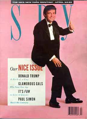 Rifling through my “pile o’ Spy” – and I’ll get back to that catchphrase later – I found, to my delight, a gigantic early ish as yet unreviewed. April 1988, “Our NICE Issue,” with short-fingered vulgarian Donald J. Trump shown on the cover leaning on a layout box of type (and on page one collapsing said box and landing on his top arse).