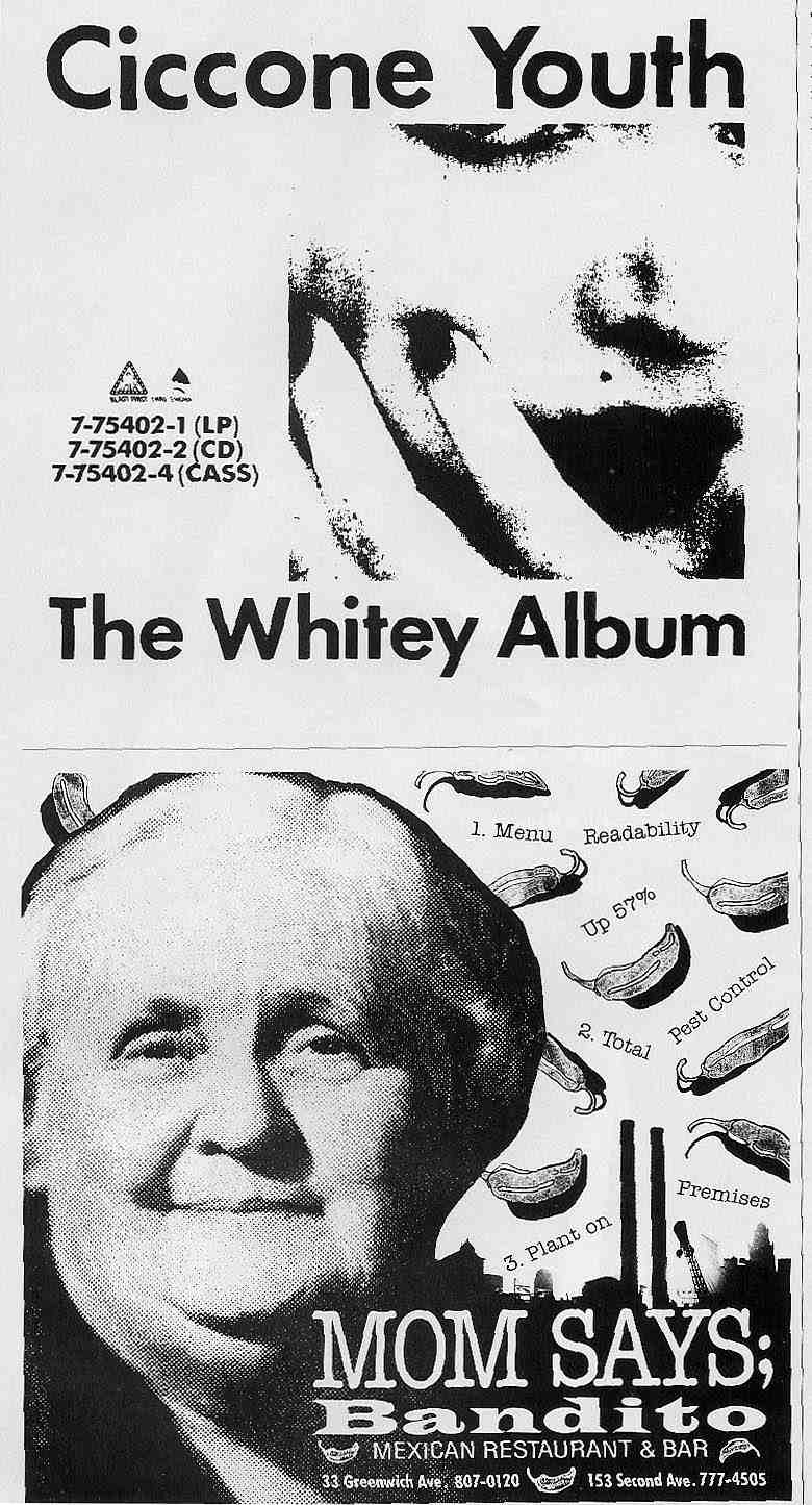 Two ads stacked atop each other on page 34 represent “kool,” “rad” homemade typography. You couldn’t be kool or rad in New York in the 1980s without an overt allegiance to Sonic Youth. Were they really that good? No. But they were critics’ darlings, and since rock critics all have the same tastes and write solely for each other’s reinforcement, we were relentlessly told Sonic Youth meant something. On a lark – indulged artiste types are permitted larks, you see – Sonic Youth “released” The Whitey Album under the nom de plume Ciccone Youth.