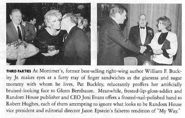 “At Mortimer’s, former best-selling right-wing author William F. Buckley Jr. makes eyes at a furry tray of finger sandwiches as the giantess and sugar mommy with whom he lives, Pat Buckley, reluctantly proffers her artificially-bruised-looking face to Glenn Bernbaum. Meanwhile, frosted-lip-gloss addict and Random House publisher and CEO Joni Evans offers a frosted-nail-polished hand to Robert Hughes, each of them attempting to ignore what looks to be Random House vice-president and editorial director Jason Epstein’s falsetto rendition of ‘My Way’ ”