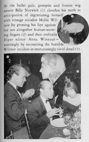 “At the ballet gala, gossipist and former wig-wearer Billy Norwich clenches his teeth in anticipation of ingratiating himself with vintage socialite Mollie Wilmot by pressing his lips against her not-altogether-human-seeming fingers and then enthralls Vogue editor Anna Wintour – seemingly by recounting the horrible Wilmot incident in excruciatingly vivid detail”