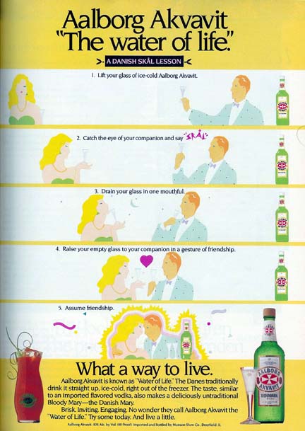 Now, if you’re from Minnesota, or if you simply do not require patrician WASP accoutrements when out to get plastered, why not try Aalborg Akvavit (no relation)? Sorry: “Aalborg Akvavit ‘The water of life’ (A DANISH SKÅL LESSON).” Yeah, it makes about as much sense as that. Interesting type, though (Novarese), set ultra-tight.