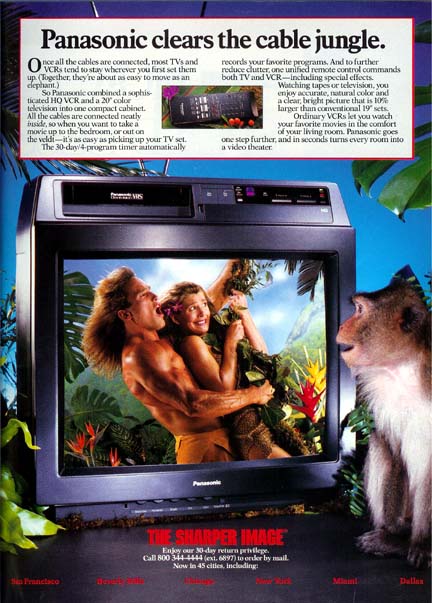 This month, the Sharper Image remains undead, and they retain their hideous colour sense. “Panasonic clears the cable jungle” declares the Plantin Bold headline for this combination TV/VCR, “so when you want to take a movie up to the bedroom, or out on the veldt – it’s as easy as picking up your TV set.”
